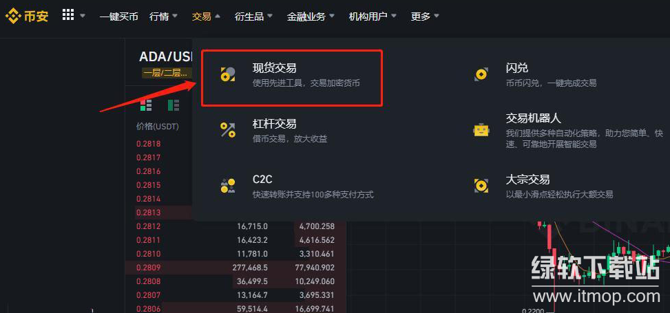 点击币某安首页上方导航栏的【交易】板块选择【现货交易】,点击进入现货交易页面。