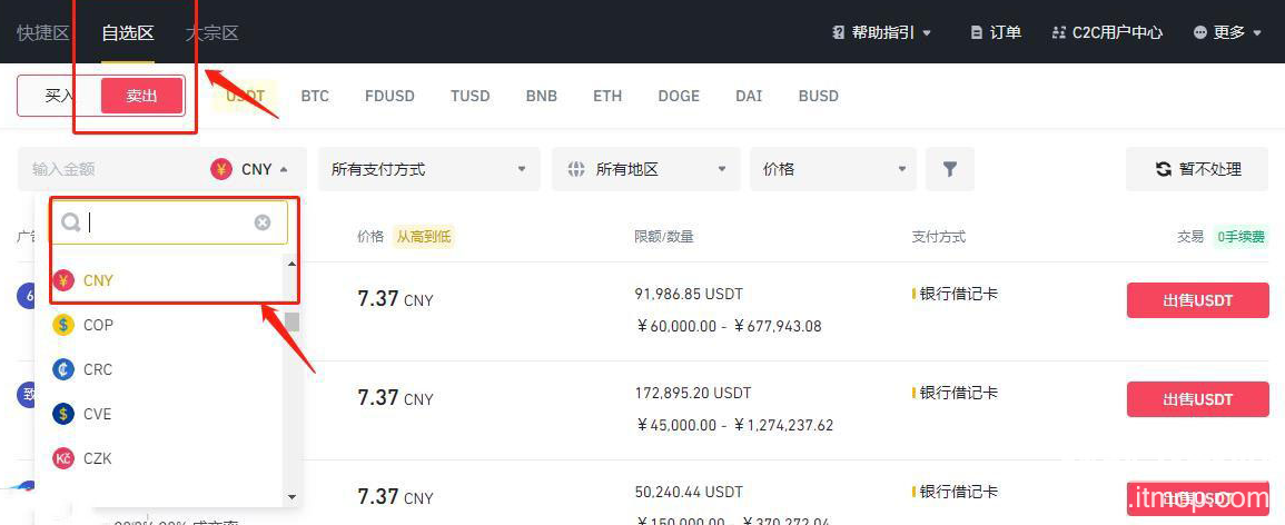 点击上方导航栏的【交易】--【C2C】,点击【自选区】,选择【卖出】,选择【CNY】,BNB币提现人民币步骤就可完成。