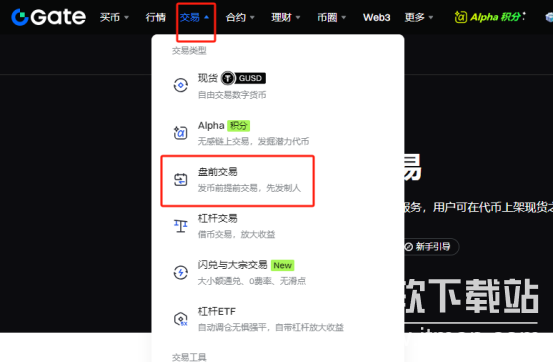 用户完成在Gate交易所的注册并登录后,可通过导航栏找到交易板块并点击,接着从中挑选盘前交易选项,由此进入盘前交易专属页面。