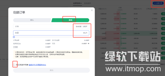 在交易界面中,用户找到并点击“创建订单”按钮(该按钮通常位于界面右上角,呈蓝色,如示例图片所示位置),随后会弹出订单创建窗口。在窗口内,用户首先选择“买入”选项,接着在价格栏输入自己期望的买入单价,在数量栏填入计划购买的WLFI代币数量,此时系统会自动计算并显示订单金额以及手续费。用户需仔细阅读盘前OTC交易服务协议,勾选同意选项后,确认所有信息准确无误,最后点击窗口内与买入操作相关的确认按钮,等待市场匹配成交。
