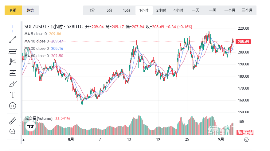 2025年SOL价格呈现高波动特征:截止9月3日,SOL价格为208.69美元,市值达1128亿美元,位列全球加密货币第6位反映出其价格对市场流动性和政策环境的高度敏感性。