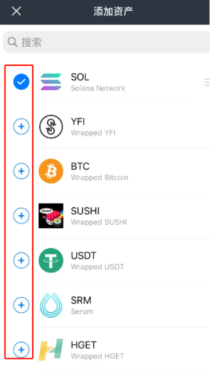 在界面下方的币种列表中,你可以根据自己的实际需求挑选所需的资产,然后点击该资产旁边的 号。