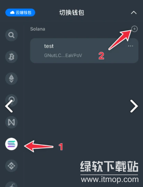 待麦子钱包安装完毕,打开钱包进入切换钱包的界面,在界面左侧找到并选定Solana公链,接着点击右上角的 号。