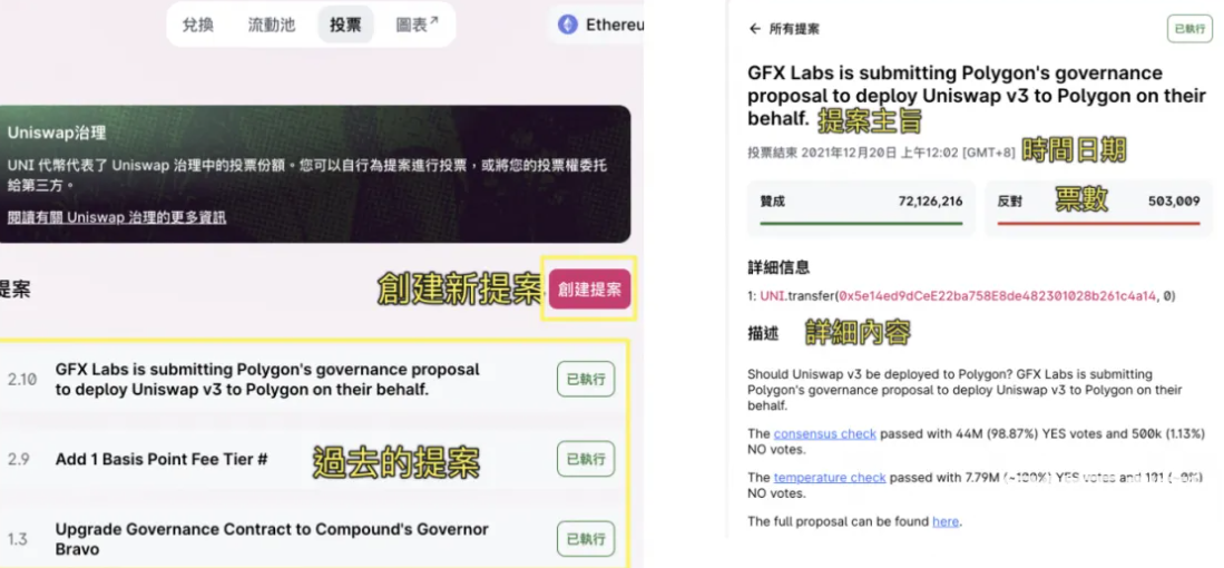 拥有UNI的用户可以针对UNIWAP现有的提案进行投票,进入「投票」分页中,往下可以看到过去执行过的提案,点进去可以查看提案内容,包括赞成与反对票数。