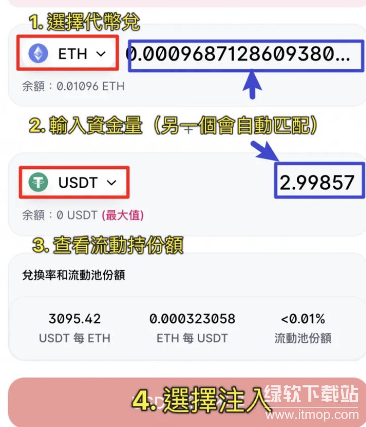 接着选择代币兑,以ETH-USDT 为示范。其中一个代币先输入资金量,另一个就会依照兑换率自动帮你换算,查看下方的份额后,就可以确定注入资金了。