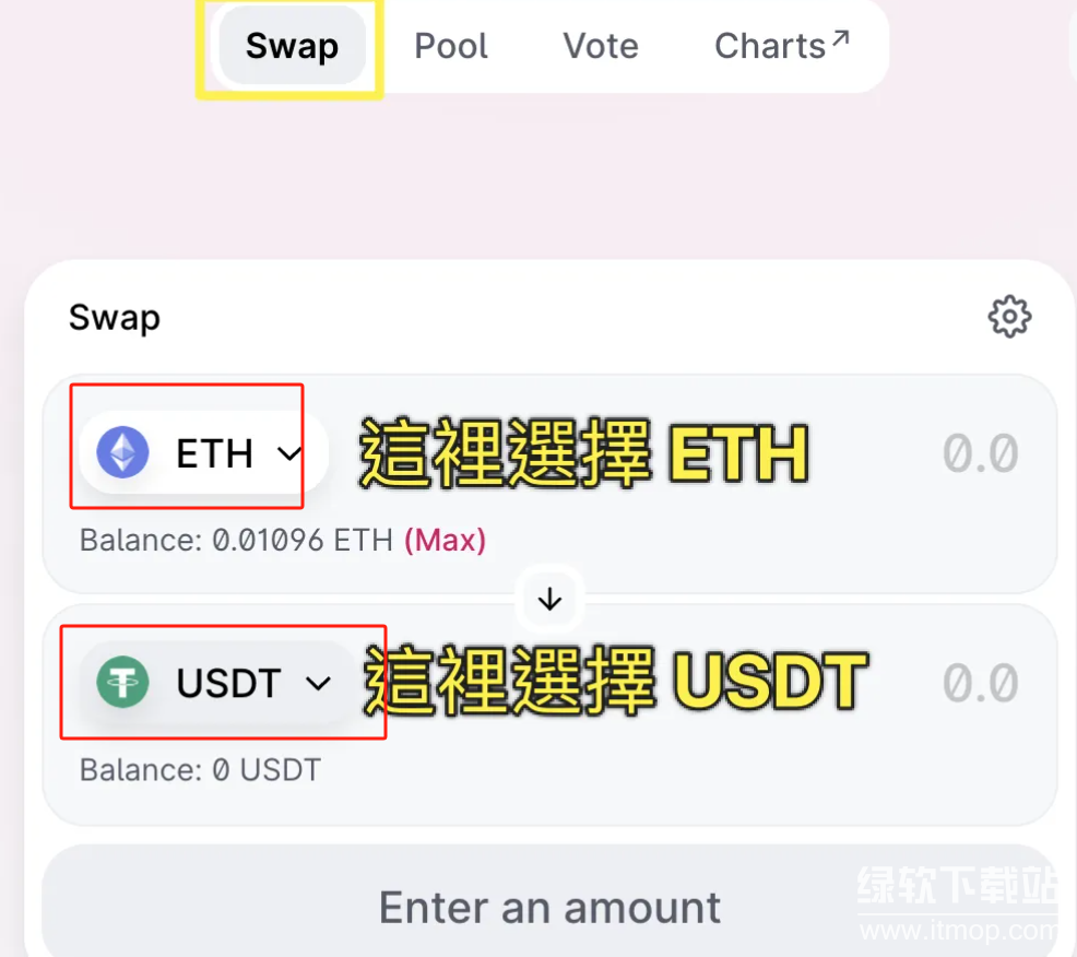 在Uniwap上面购买加密货币,以以太网购买USDT为例,进入Uniwap首页,在上方选单中进入"(Swap)兑换",可以在下方看到交易视窗。我们在上面的栏位选择ETH,下面栏位选择USDT。