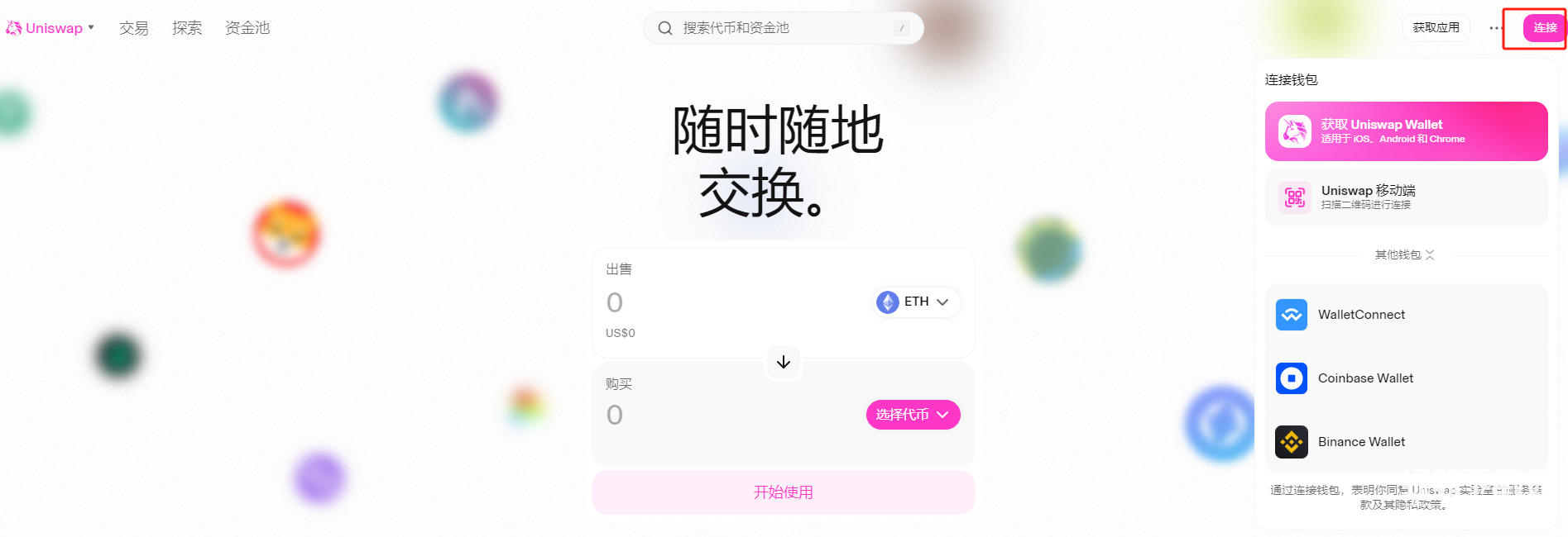 以huli钱包为例,連接 Uniswap交易所。进入Uniswap网页,系统会要求你连接钱包,点击右上角的连接钱包按钮。