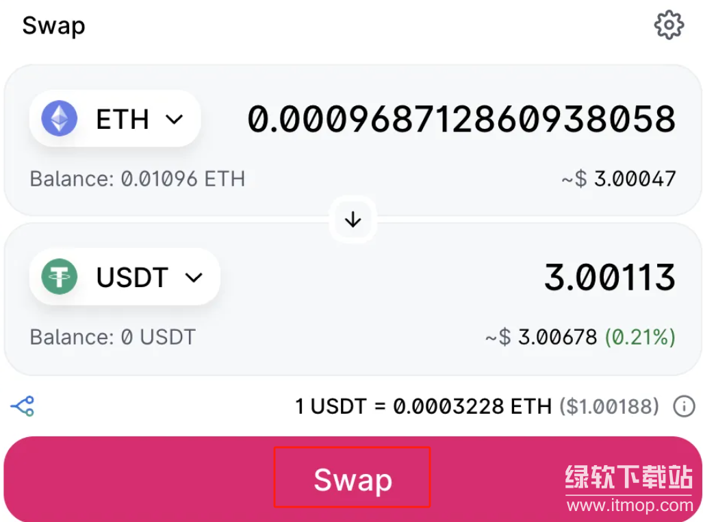 接着输入 ETH 的数量,系统会自动帮你换算可以买到的 USDT,确定好之后,在下方点选Swap,就可以买了。