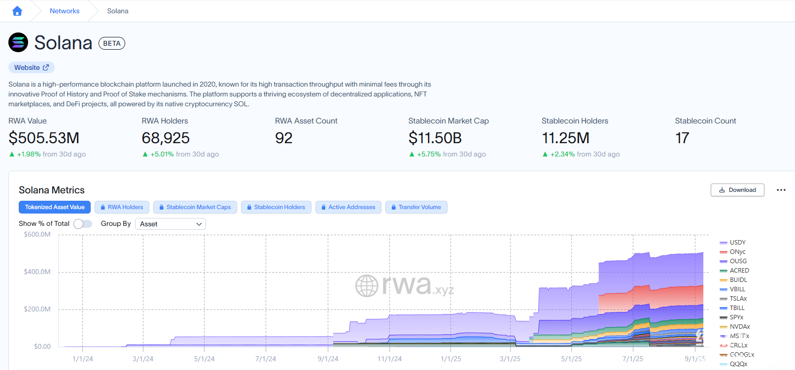 全球RWA代币化规模截至2025年9月达667.9亿美元,而Solana凭借高吞吐量(65,000 TPS)和低手续费(0.001美元以下)的技术特性,成为RWA赛道的重要增长极。从数据看,Solana链上RWA规模在2025年呈现爆发式增长,8月已达4.18亿美元,9月进一步增至5亿美元,周持有者数增长5.01%,中小用户参与度持续提升。这种增速不仅源于技术优势,更得益于生态内“代币化—交易—质押”的闭环协同,例如DeFi协议Marinade、Orca与RWA项目深度整合,形成资产流通的完整链路。