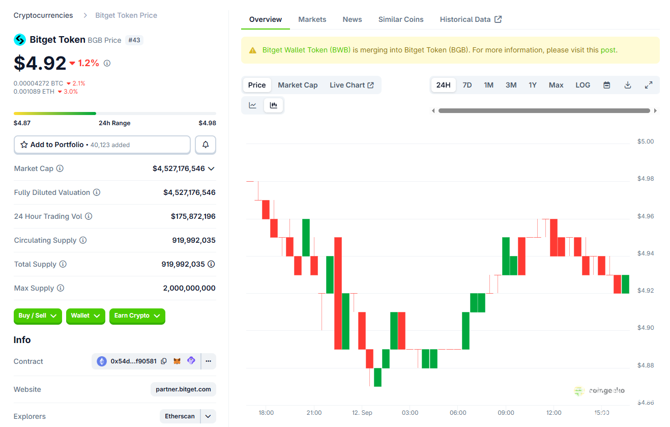 从市场数据来看,截至2025年9月,BGB当前价格为4.92美元,市值排名全球第43位,24小时交易量达1.2亿美元,较2024年同期增长210%。这一表现既反映了BGB销毁机制带来的通缩效应,也体现了其生态扩展对市场流动性的拉动作用。