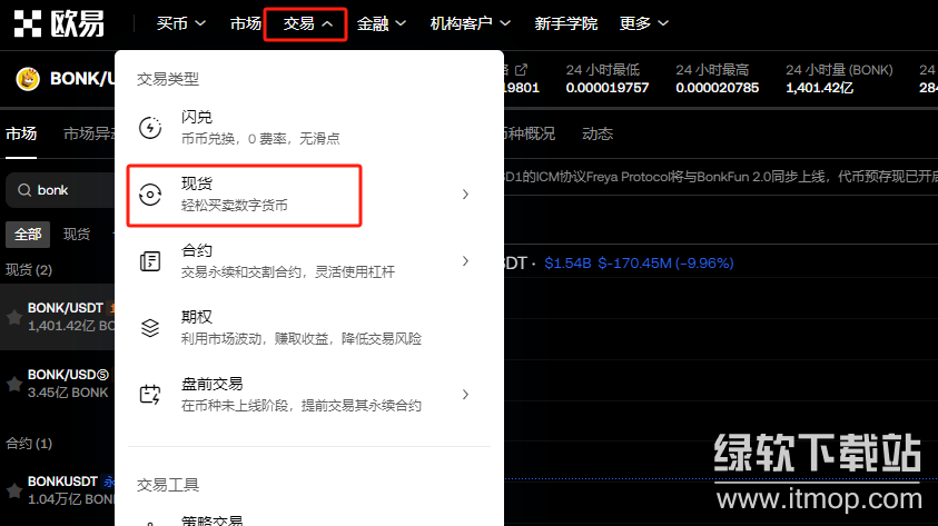 进入欧意的交易页面,在欧意交易所的Web端界面,顶部的导航栏选择交易板块,选择现货交易。