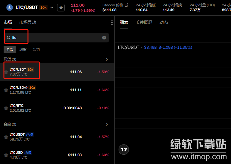 在现货交易页面,左上方的搜索框中输入LTC/USDT交易对,进入交易对的页面。