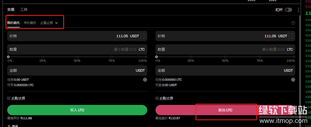 在交易页面的底部,可以看到”买入“和”,”卖出“选项,点击“卖出”按钮,根据自身需求选择合适的委托方式卖出LTC币即可。