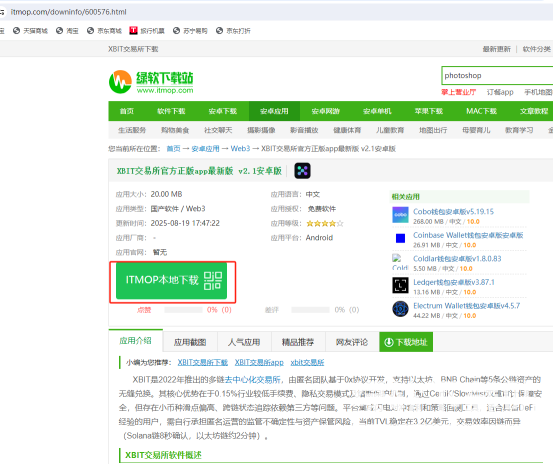 用户在itmop网站进行搜索操作,输入关键词“xbit”后,成功进入xbit的下载页面。在该页面中,用户看到“itmop本地下载”选项,点击后页面跳转至xbit的官方网站。