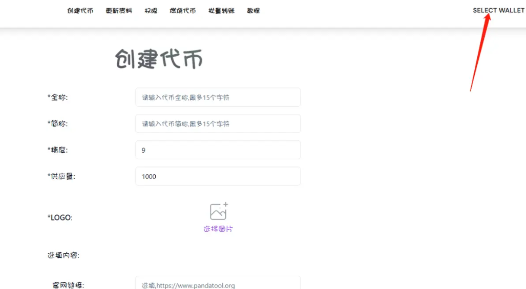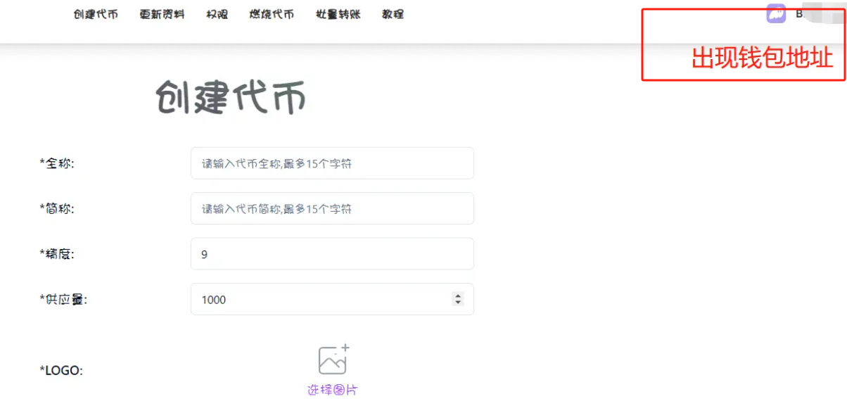 在创建代币页面,右上角出现钱包地址,表示已经完成了钱包链接。