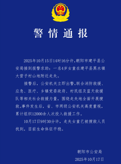 2025年10月15日14时16分许,朝阳市建平县公安局接到报警求助:一名4岁女童在建平县黑水镇大营子村山地附近走失。
