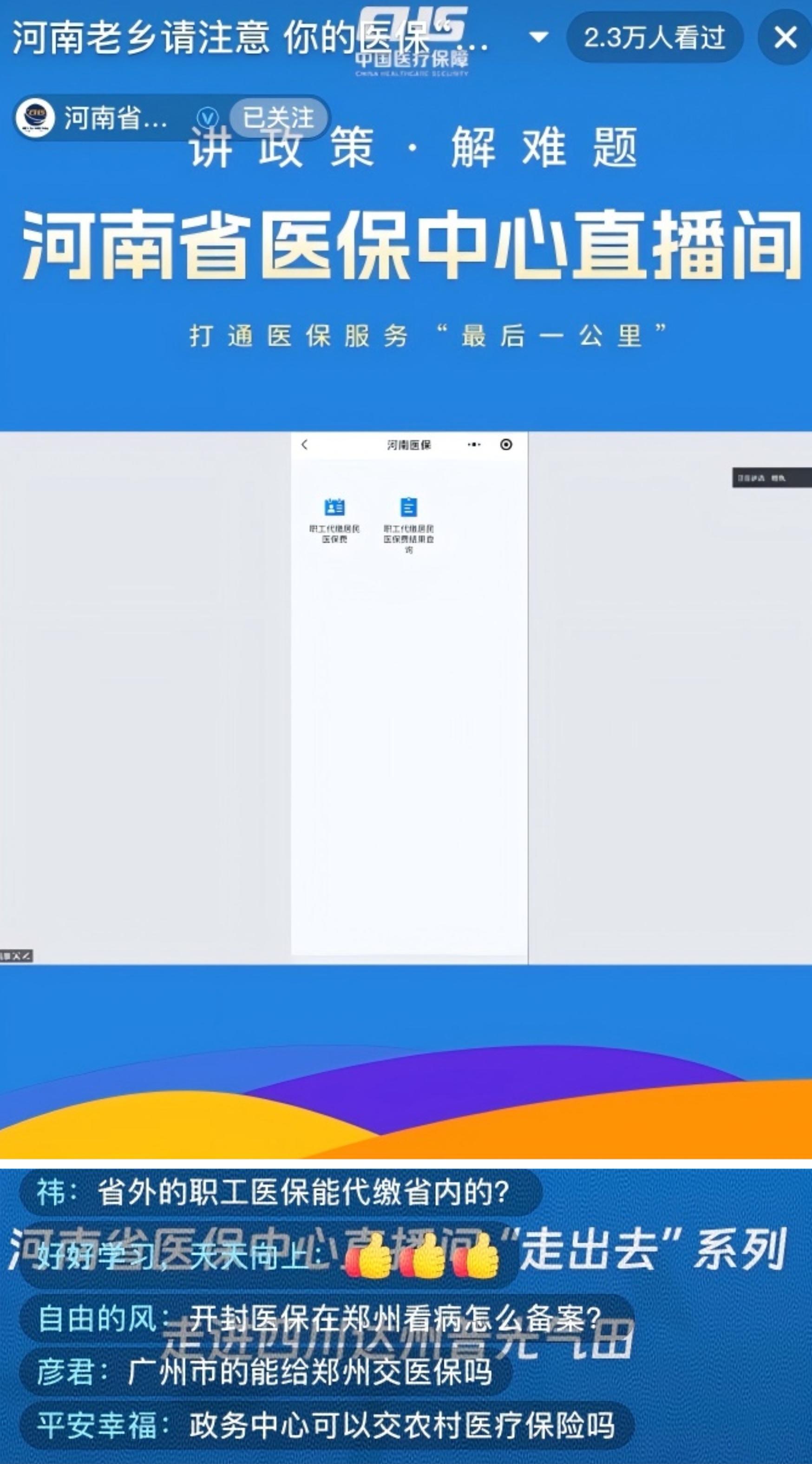 “各位网友、工友,大家下午好,欢迎锁定河南省医保中心直播间。”伴随着熟悉的开场白,河南省医保中心直播间准时开播,大量网友通过抖音、视频号、大河网直播平台涌入医保直播间,一时间,公屏上留言咨询的内容飞速滚动。