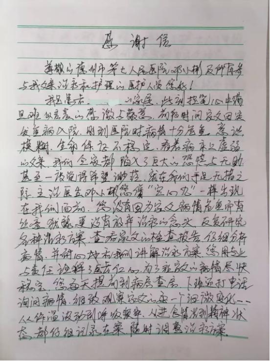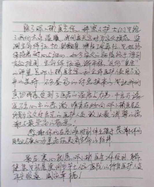 “就在我们手足无措之际,主任医师邓小彬像定心丸一样出现在我们面前,您没有因为家父病情危重而有丝毫犹豫,反复研究各种治疗方案,查看检查报告,仔细分析病情,耐心讲解治疗方案。”家属在信中这样描述当时的场景。